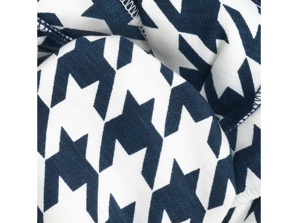 Horní a spodní okraj jsou lemovány pružným stehem s barevným odlišením pro snadnější orientaci při vázání.